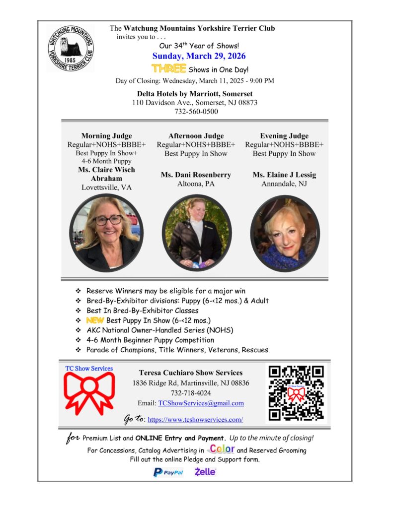 Go to https://TCShowServices.com under Specialty Shows/WMYTC to see our Premium List and Judging Program (when available) and to make online entries opening on February 1, 2026, by closing on March 11, 2026, by 9:00 PM EST. Don’t forget to reserve your grooming spot on the Pledge and Support Form also found there.